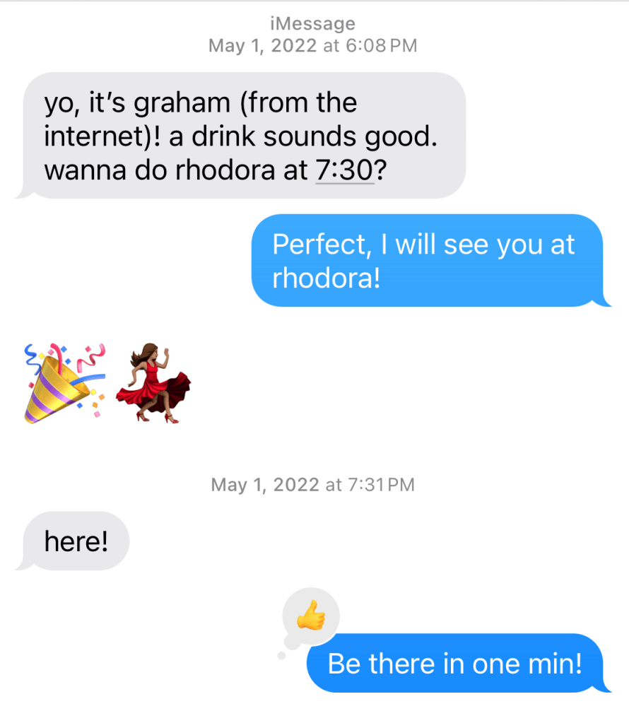 After a match on a Hinge and a typically slow response time from Alex, she suggests they grab a drink on a beautiful Sunday in May 🙂